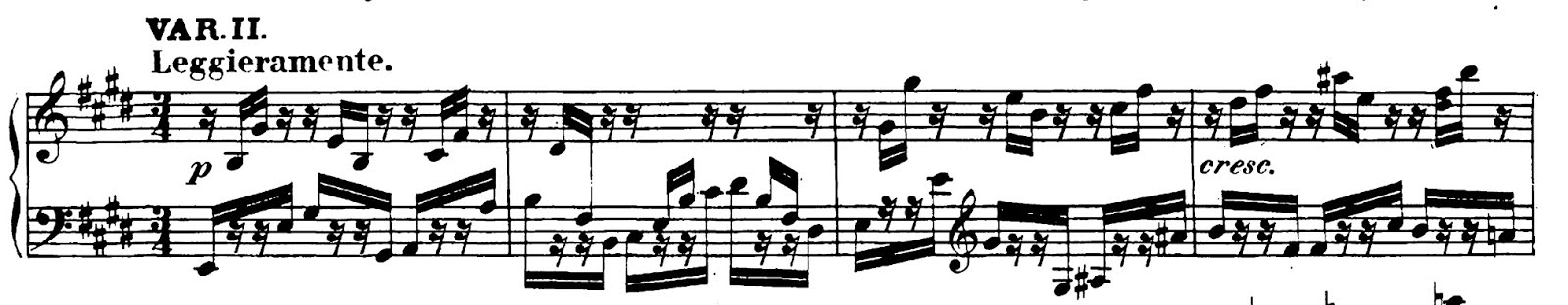 Within both non-narrative and narrative music, the specificity of score markings varies greatly. For instance, Beethoven’s scores are extremely detailed, and he intended every marking and Italian indication to be taken seriously. Brahms didn’t much care for markings, and chose to leave many of these technicalities for the performer to figure out. It’s important to keep in mind that the amount of markings don’t exactly have a bearing on context, as they depend on the style and conventions of the composer. They only offer easy means to structure and convey ideas, but do not precisely link to perception. I remember when I was working on Beethoven’s op.109 a few years ago, and came upon these sixteenth notes in the second variation of the third movement, marked leggieramente (as lightly as possible):