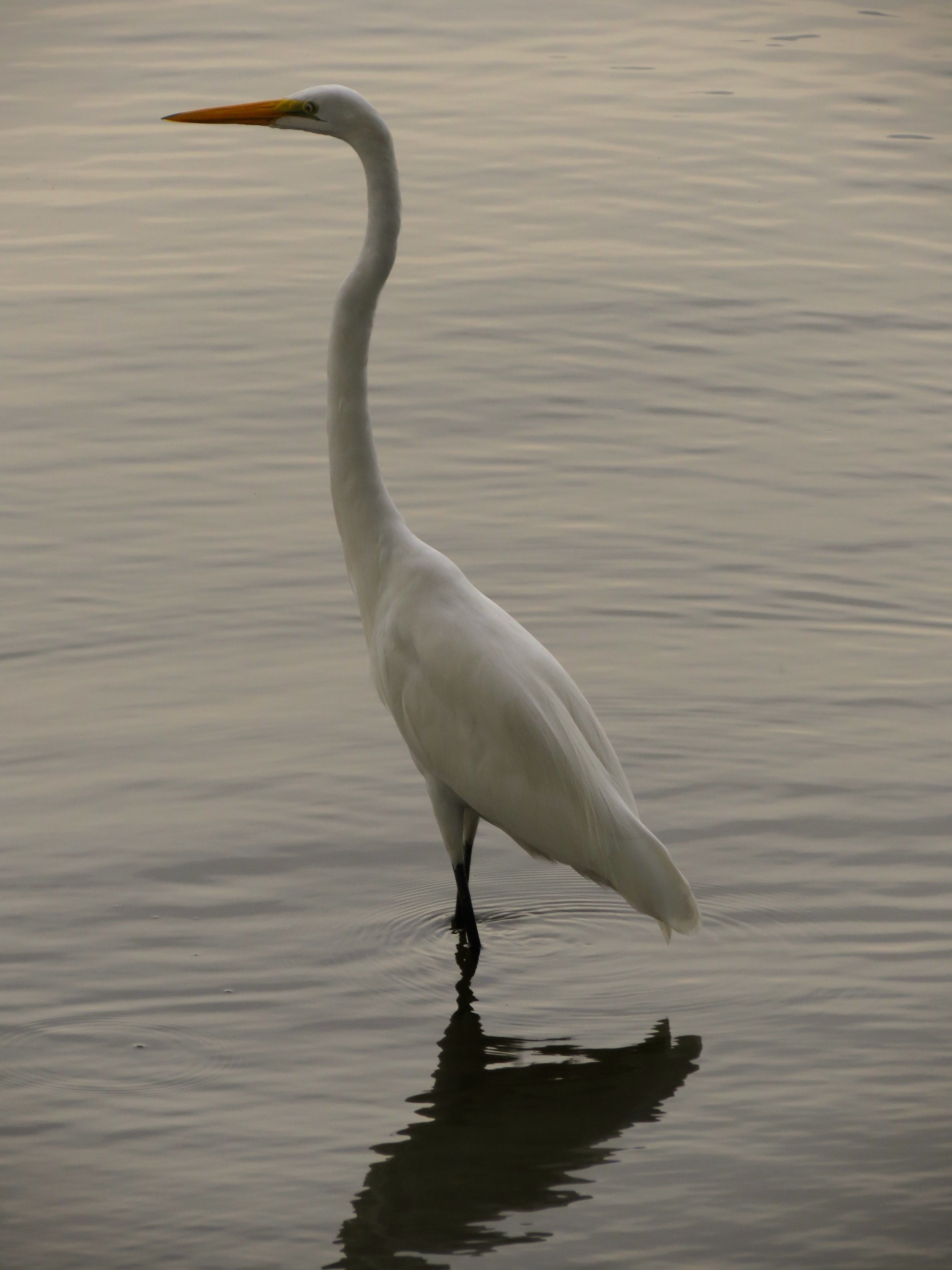 Gran garza blanca, de amplia distribución (todo el año en Sudamérica y África, también se reproduce y migra en Norteamérica, Europa y Asia). Suele encontrarse encolonias numerosas, en zonas húmedas. Este ejemplar fue fotografiado en la Laguna Rodrigo de Freitas en Río de Janeiro. En Brasil, la garza aparece al reverso del billete de 5 reales.