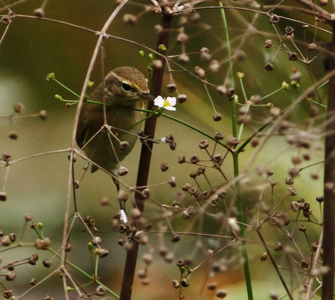 Chiffchaff (Phylloscopus collybita) looking for aphids on an Alisma Lanceolatum, Judean Hills, Israel