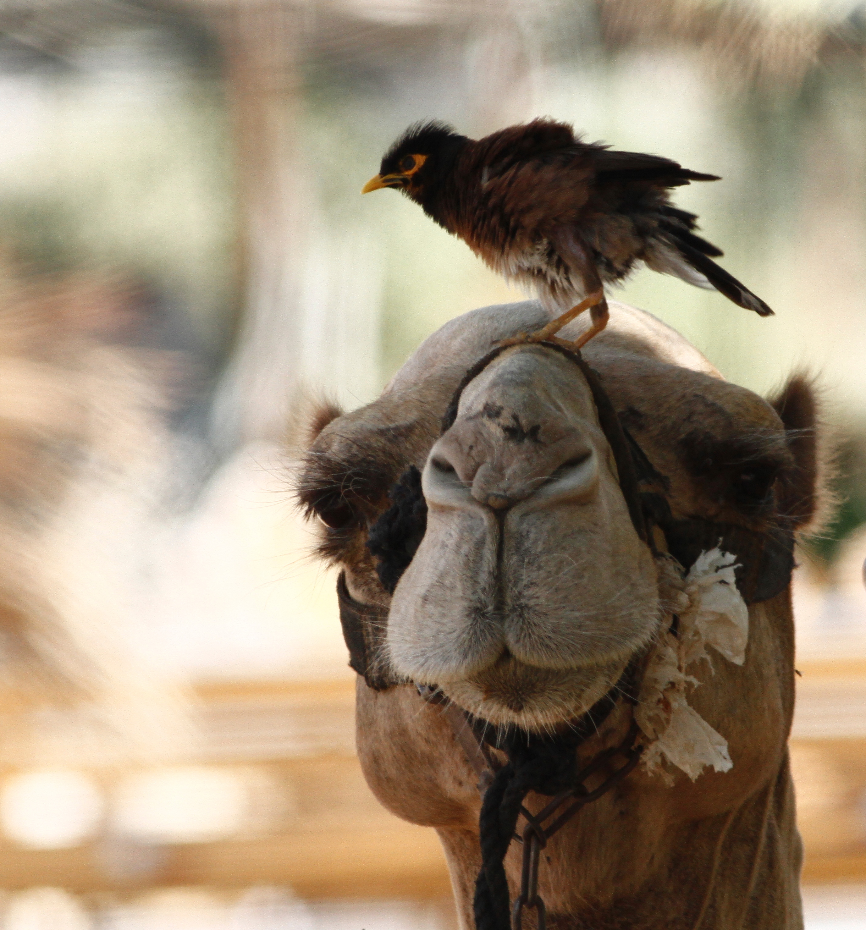 Common Myna (Acridotheres tristis) on a camel’s head (Camelus dromedarius), Almog, Judean Desert, Israel