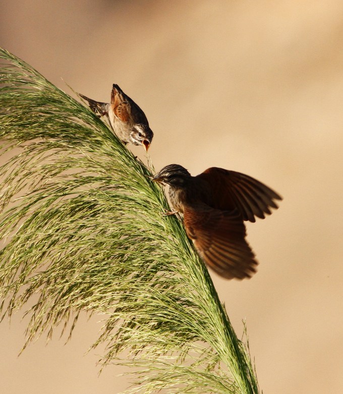 Mountain Bunting (Emberiza striolata) fighting for seeds of Phragmites Australis, Og River, Judean Desert, Israel