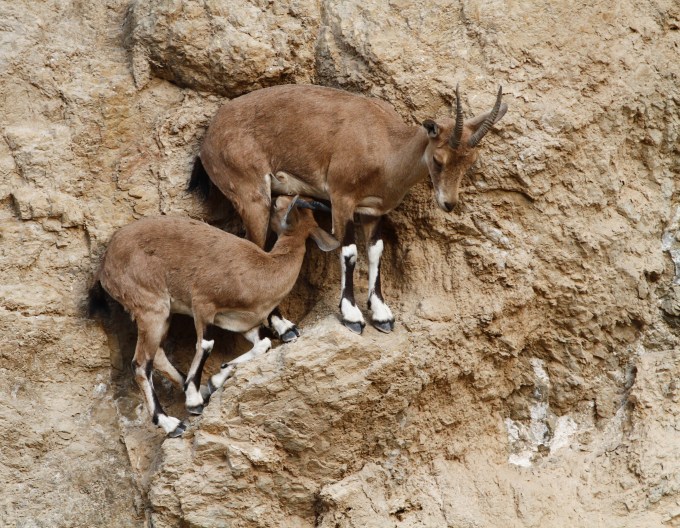 The Nubian ibex (Capra nubiana) kid suckling from his mother on a cliff, Bokek River, Judean Desert, Israel