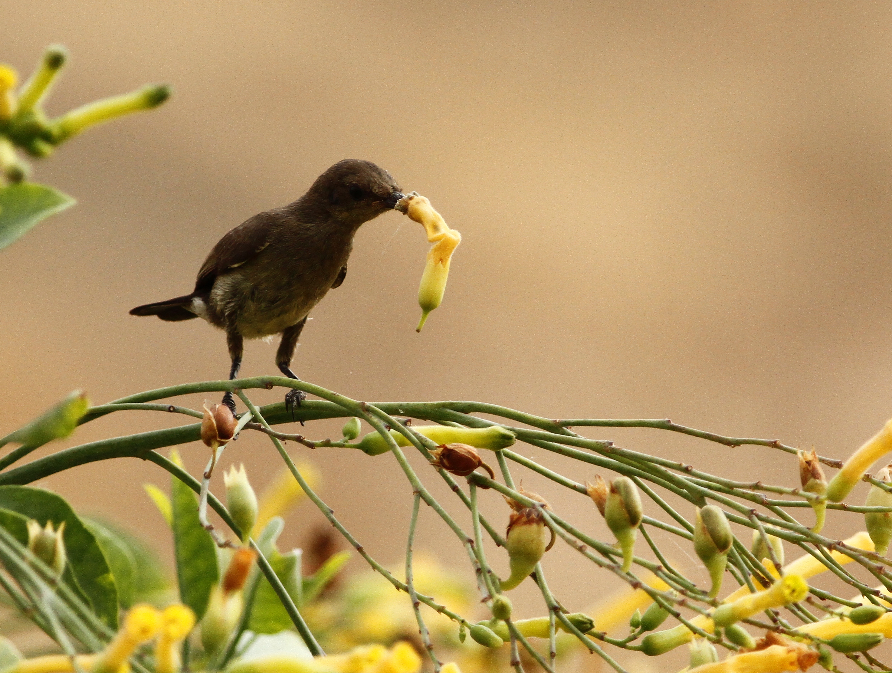 Palestine Sunbird (Nectarinia osea) with a Nicotiana Glanca flower caught in its beak, Prat River, Judean Desert, Israel