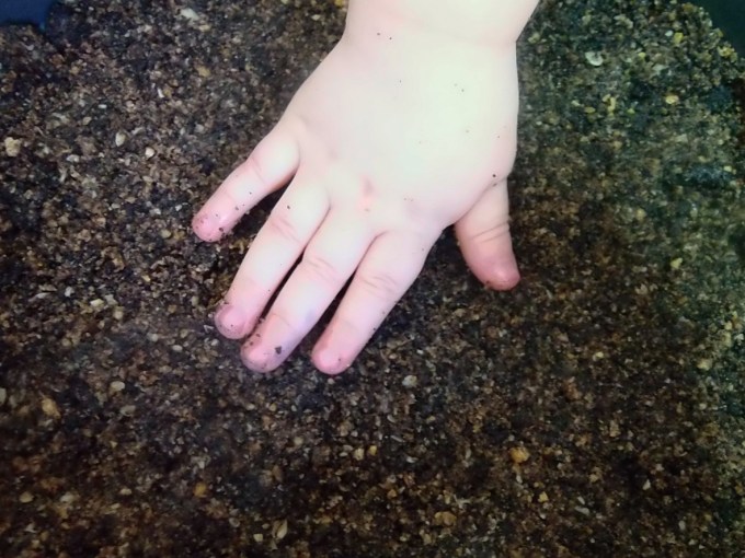 - Once the butter is all melted mix it together with the crushed cookies. This is the base of your cake. Take this crumb mixture and place it firmly on the bottom of your cake pan. Once you’ve got a nice firm base to your cake leave it in the refrigerator to chill.