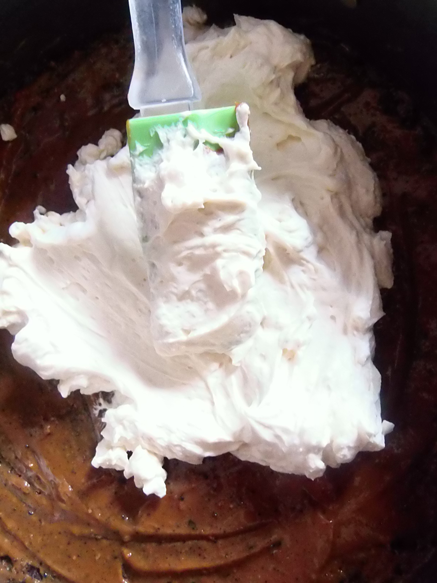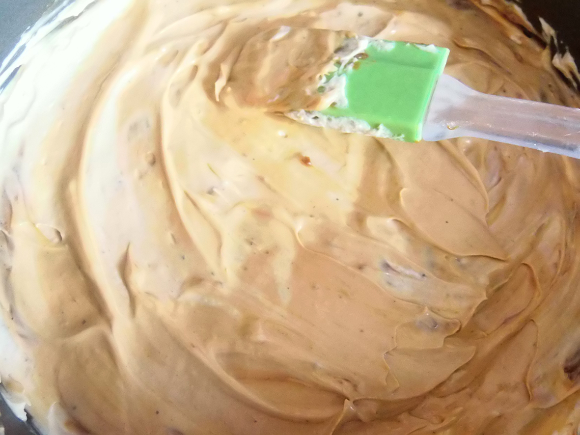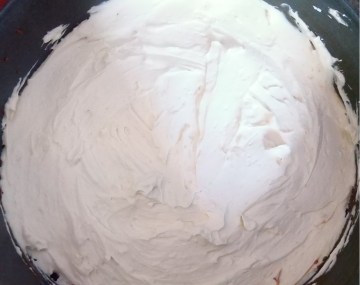 - Add the liquid cream to the mixing bowl and blend it in on medium-high speed for another 2 minutes, more or less. You shoul have a nice thick but fluffy substance by now.