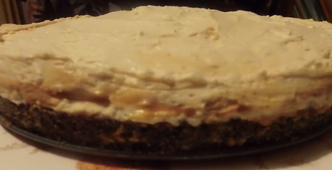 - Get the cake base from the fridge. Take 2 spoons of your caramel and spread them all over the bottom of your cake. Work with the paste. After moving it around a bit it’s much easier to work with and spread around.