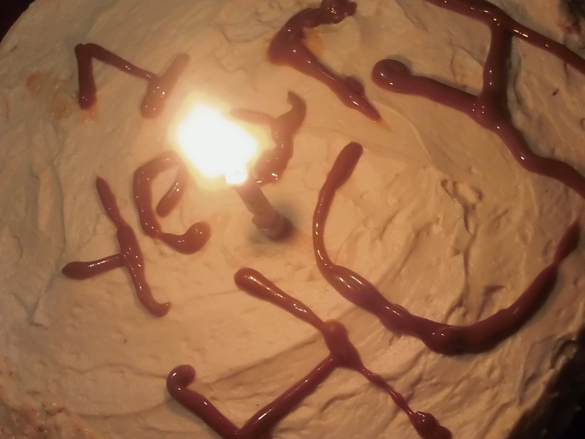 - After it has chilled for some hours you can open the cake pan and then decorate the top with at least one spoonfull of caramel. I decorated it with a message for the one year anniversary of Humano, creativamente humano, but as you can see my decorative skills aren’t sky-high so I’d rather not explain how exactly one decorates a cake…