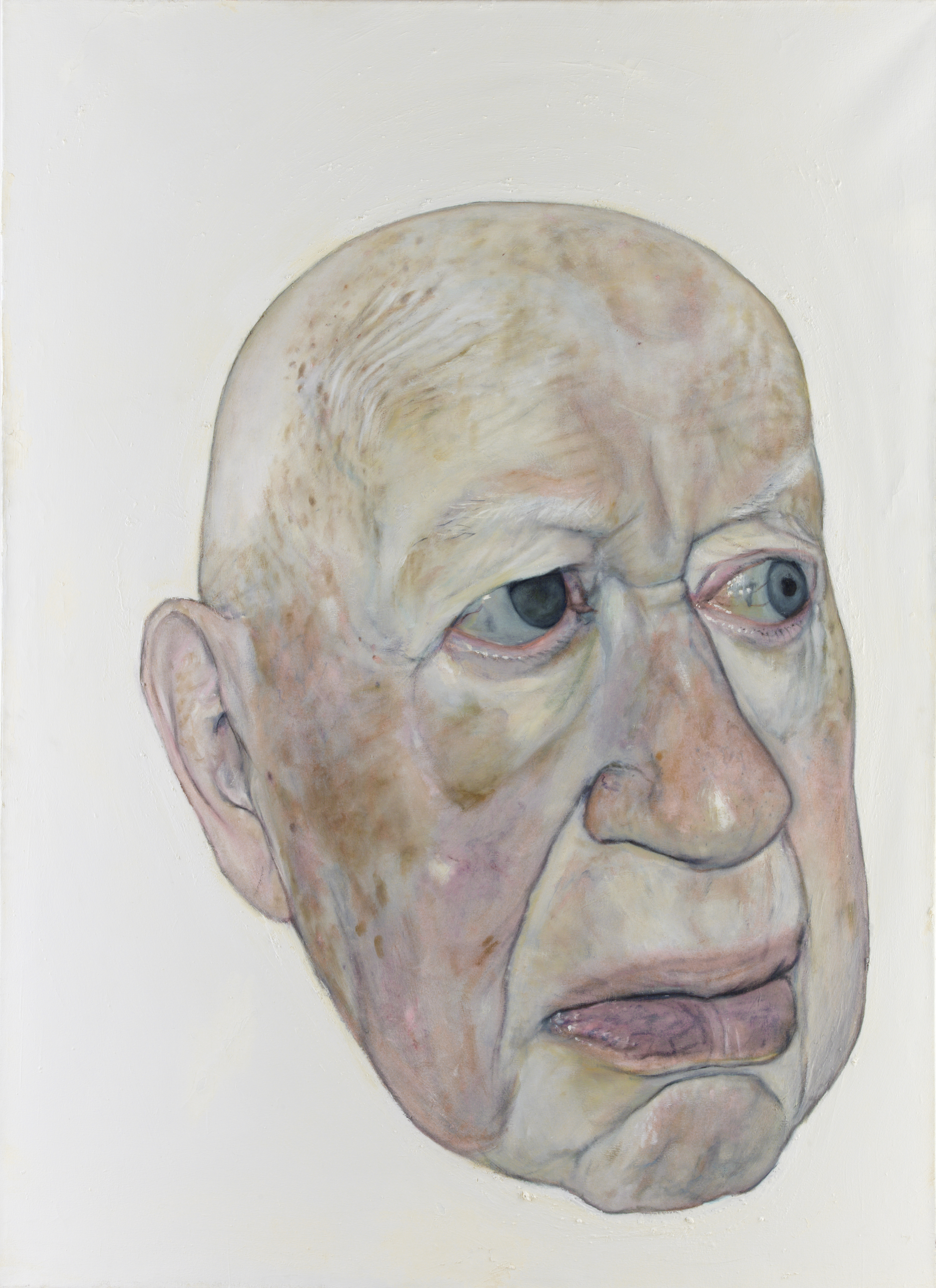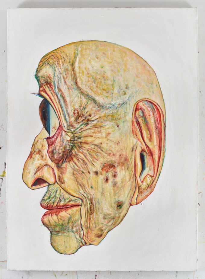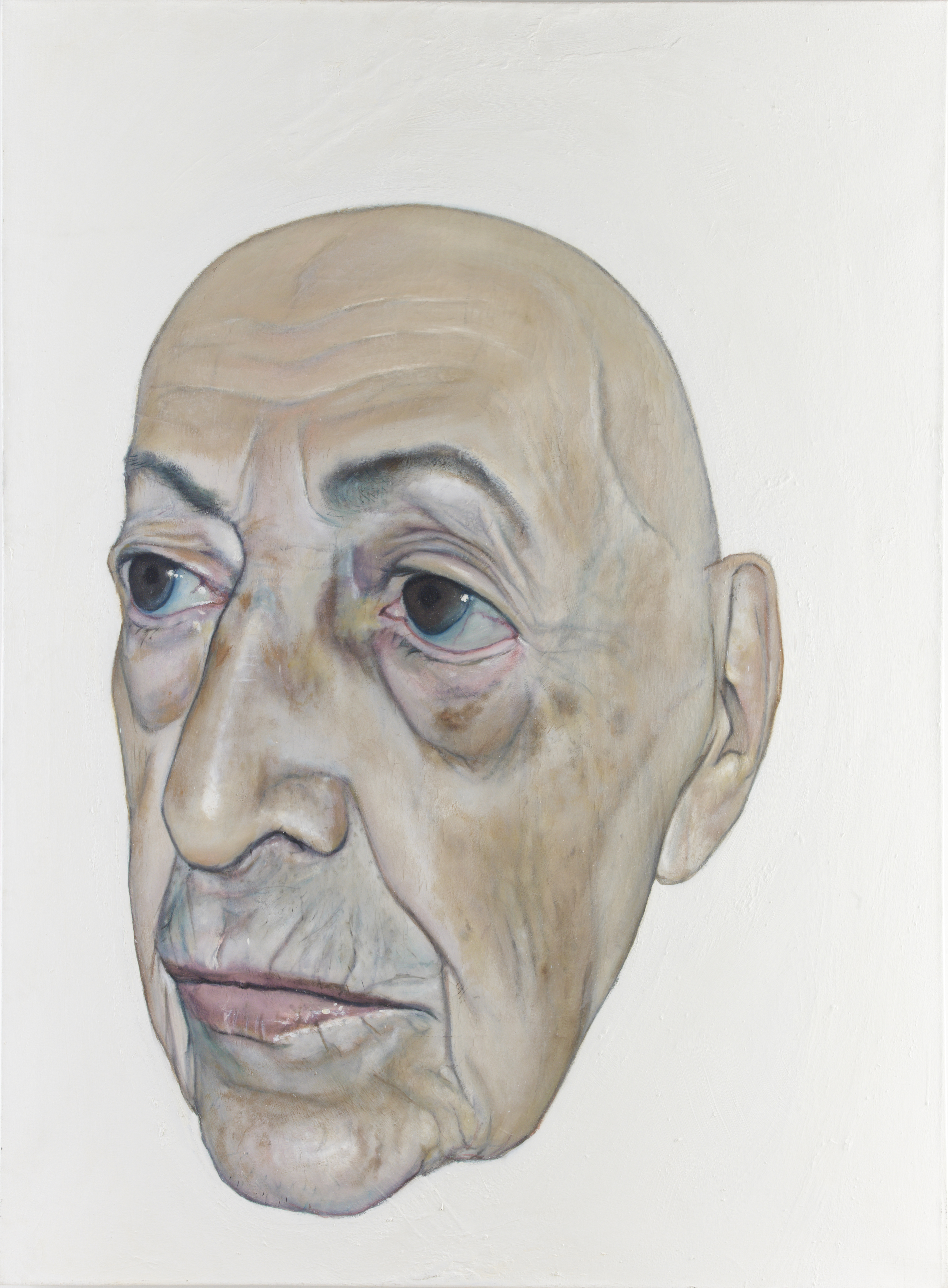 Miki Carmi’s oil paintings of hairless, elderly faces are haunted by many dark pasts. Though the people depicted in his paintings are his relatives, his treatment of them is anything but sentimental. Enlarged, shorn and detached from bodies, each face becomes a study of how life leaves its marks on the skin. Carmi turns his family members’ faces into landscapes in which fastidiously rendered veins, wrinkles and sun spots demarcate the surfaces and represent forces of entropy and decay. The hyper-real technique most evident in his early paintings is counterbalanced by his act of symbolic erasure, as he eliminates his subjects’ torsos and limbs. Though he seduces our look with his detailed epidermis, the experience of beholding his suspended figures is unsettling. Magnification and disembodiment evoke the visual language of the specimen, suggesting that we are engaged in a kind of clinical observation of these subjects, who, though severed from their bodies, still seem alive and mildly annoyed by the presence of a viewer. His figures do not return our gaze – their lips are pursed and their bearing suggests resignation and even mild discomfort. Those hardened jaws and unreturned looks engender the sense that morbid curiosity drives our desire to scrutinize subjects of the paintings. Carmi’s subjects do not look at us, but it feels as though they judge us for standing before them.