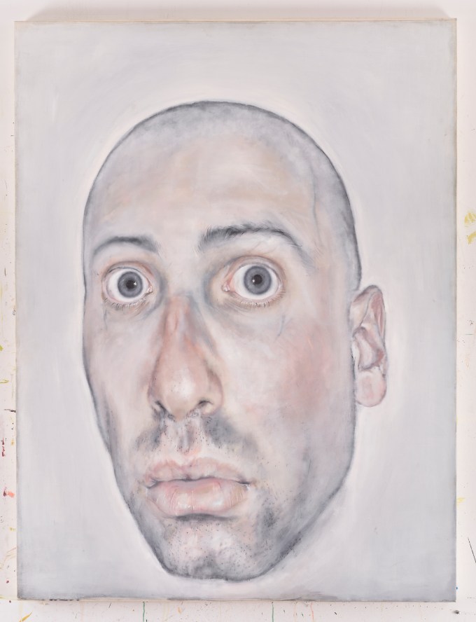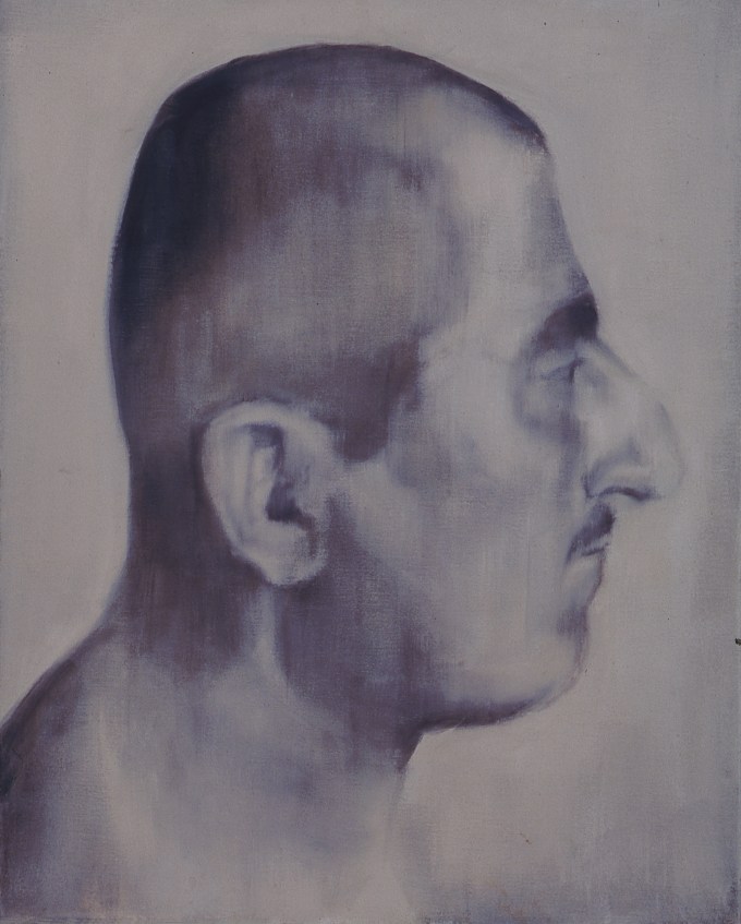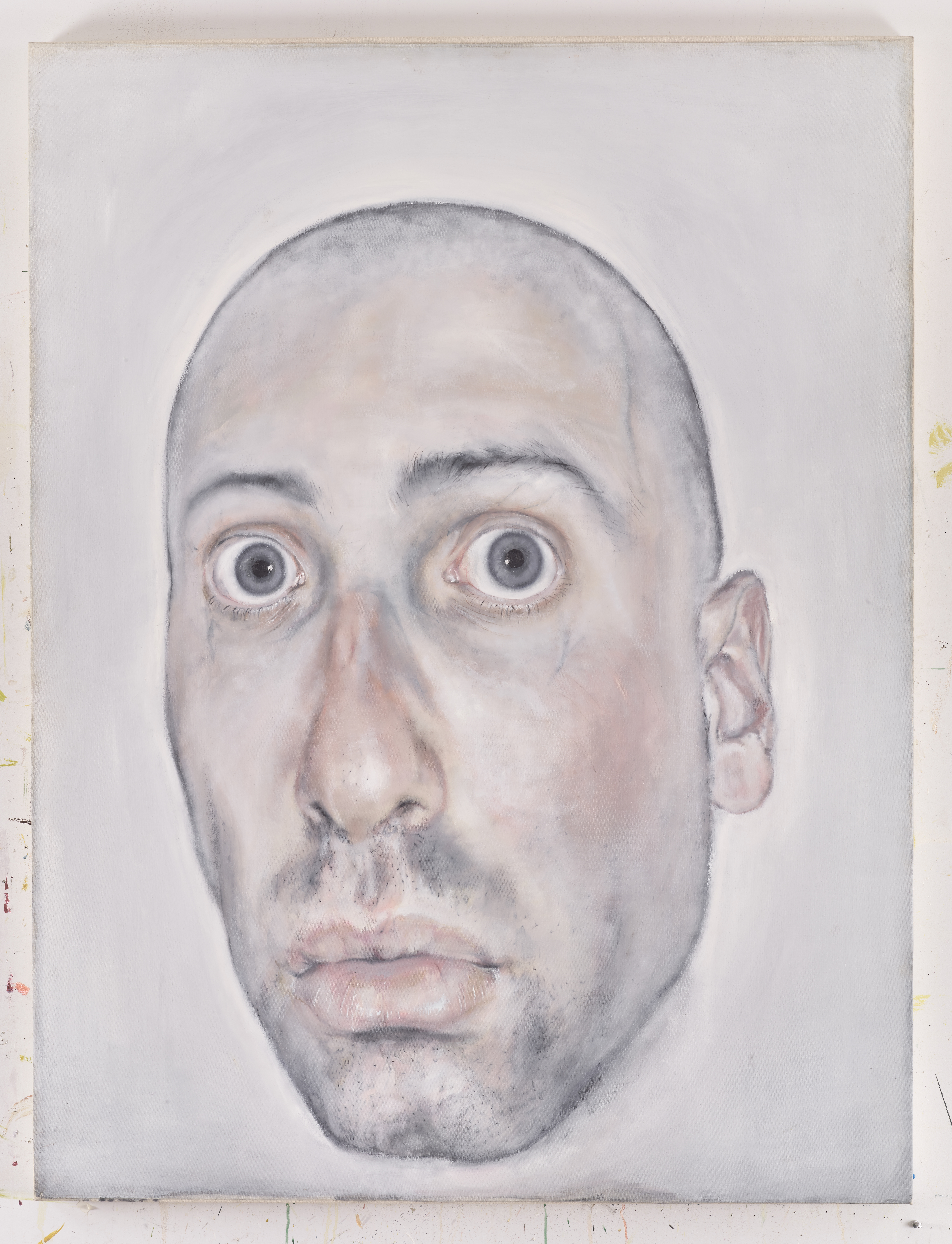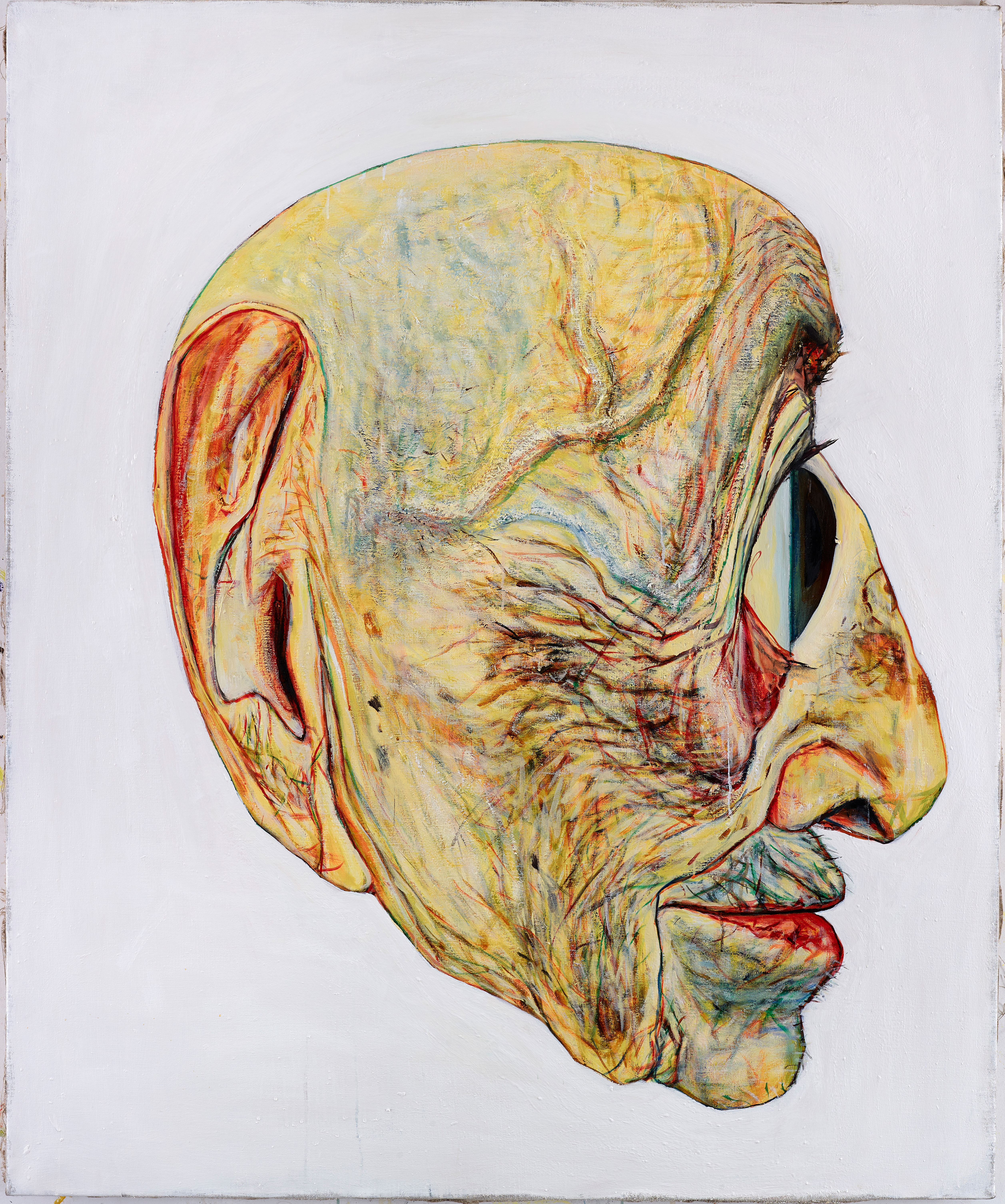 Miki Carmi’s oil paintings of hairless, elderly faces are haunted by many dark pasts. Though the people depicted in his paintings are his relatives, his treatment of them is anything but sentimental. Enlarged, shorn and detached from bodies, each face becomes a study of how life leaves its marks on the skin. Carmi turns his family members’ faces into landscapes in which fastidiously rendered veins, wrinkles and sun spots demarcate the surfaces and represent forces of entropy and decay. The hyper-real technique most evident in his early paintings is counterbalanced by his act of symbolic erasure, as he eliminates his subjects’ torsos and limbs. Though he seduces our look with his detailed epidermis, the experience of beholding his suspended figures is unsettling. Magnification and disembodiment evoke the visual language of the specimen, suggesting that we are engaged in a kind of clinical observation of these subjects, who, though severed from their bodies, still seem alive and mildly annoyed by the presence of a viewer. His figures do not return our gaze – their lips are pursed and their bearing suggests resignation and even mild discomfort. Those hardened jaws and unreturned looks engender the sense that morbid curiosity drives our desire to scrutinize subjects of the paintings. Carmi’s subjects do not look at us, but it feels as though they judge us for standing before them.