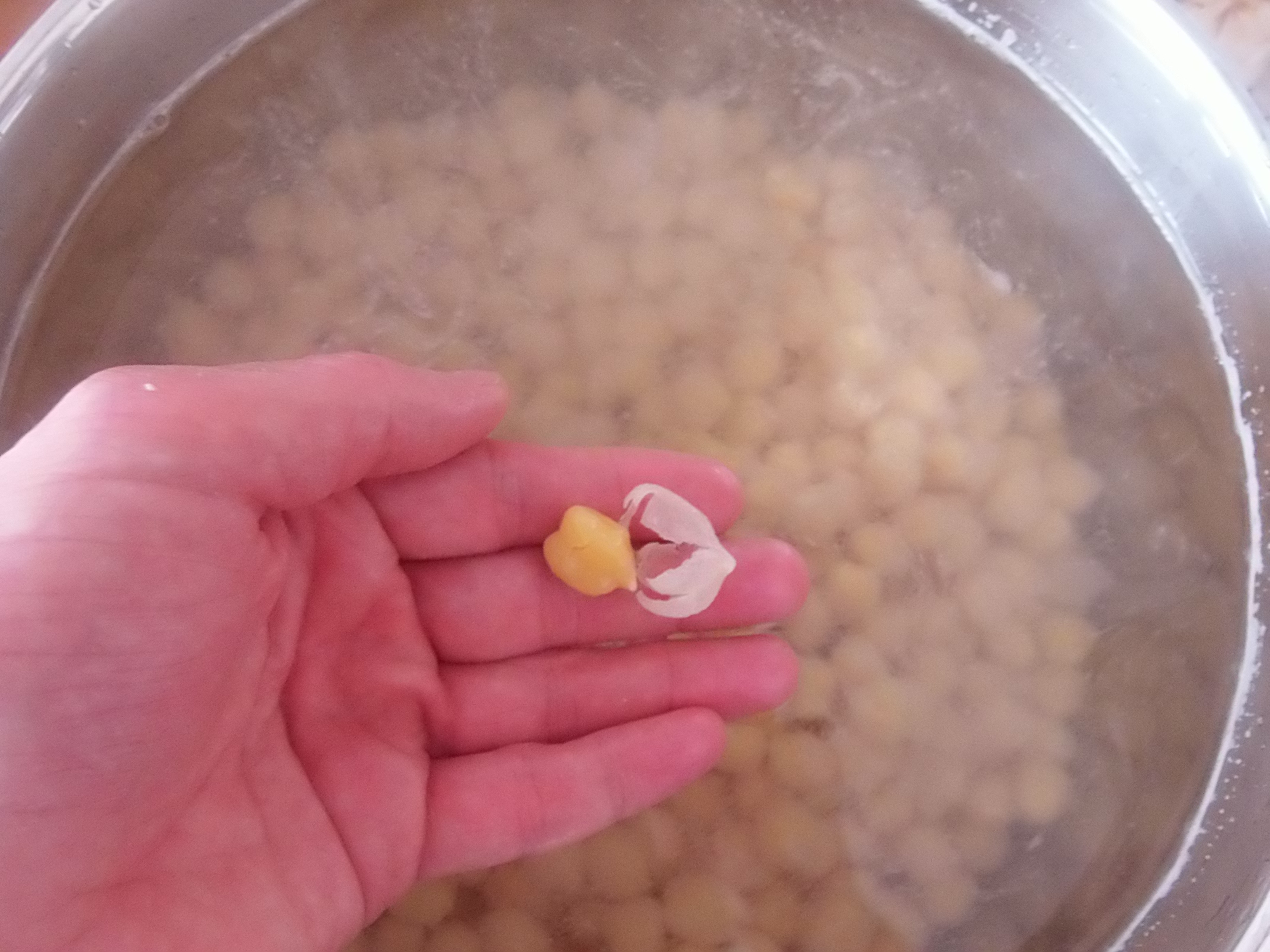 - Once your chickpeas are soft drain them: get rid of the water they were in and dump them into cold water. Separate about 10% of your chickpeas and put them aside. Now it’s time to get rid of the skins. There are different ways to do this but the best way (and longest, unfortunately) is to go one by one: take a handful of chickpeas, squeeze each one gently and a small transparent skin will separate from the chickpea. Skin all chickpeas except for about 10%. Wash the skinned chickpeas and put them back into a pot with cold water. Add a Tbsp. of salt and put the pot back on the stove. Set fire to medium.