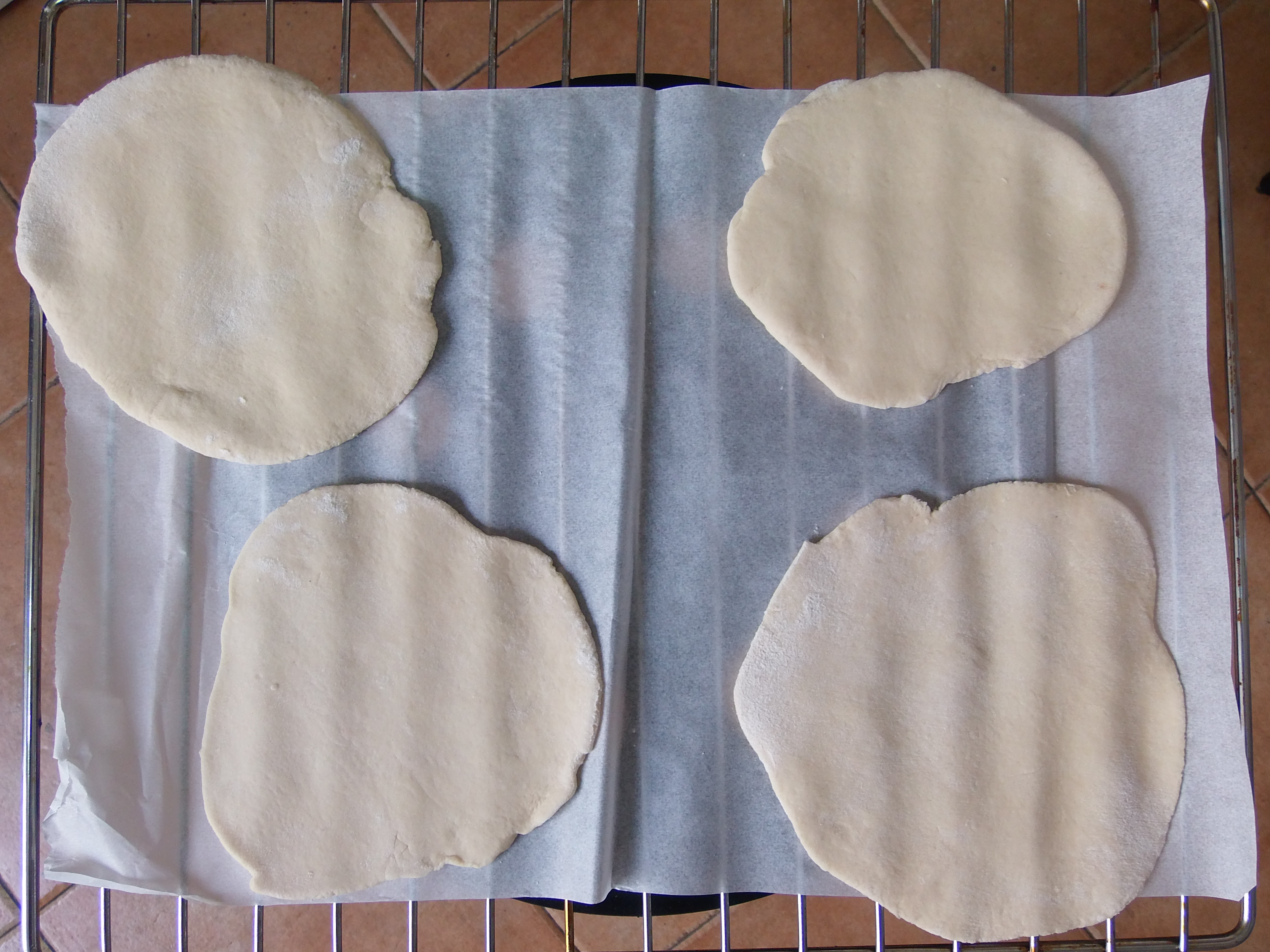 - Take your dough out of the mixing bowl. Knead for about a minute. Separate you dough into 8 equal balls. Roll each ball to a thickness of 1 cm. Place 4 on each baking tray (with baking paper), cover with towels and set aside for another 30 minutes.