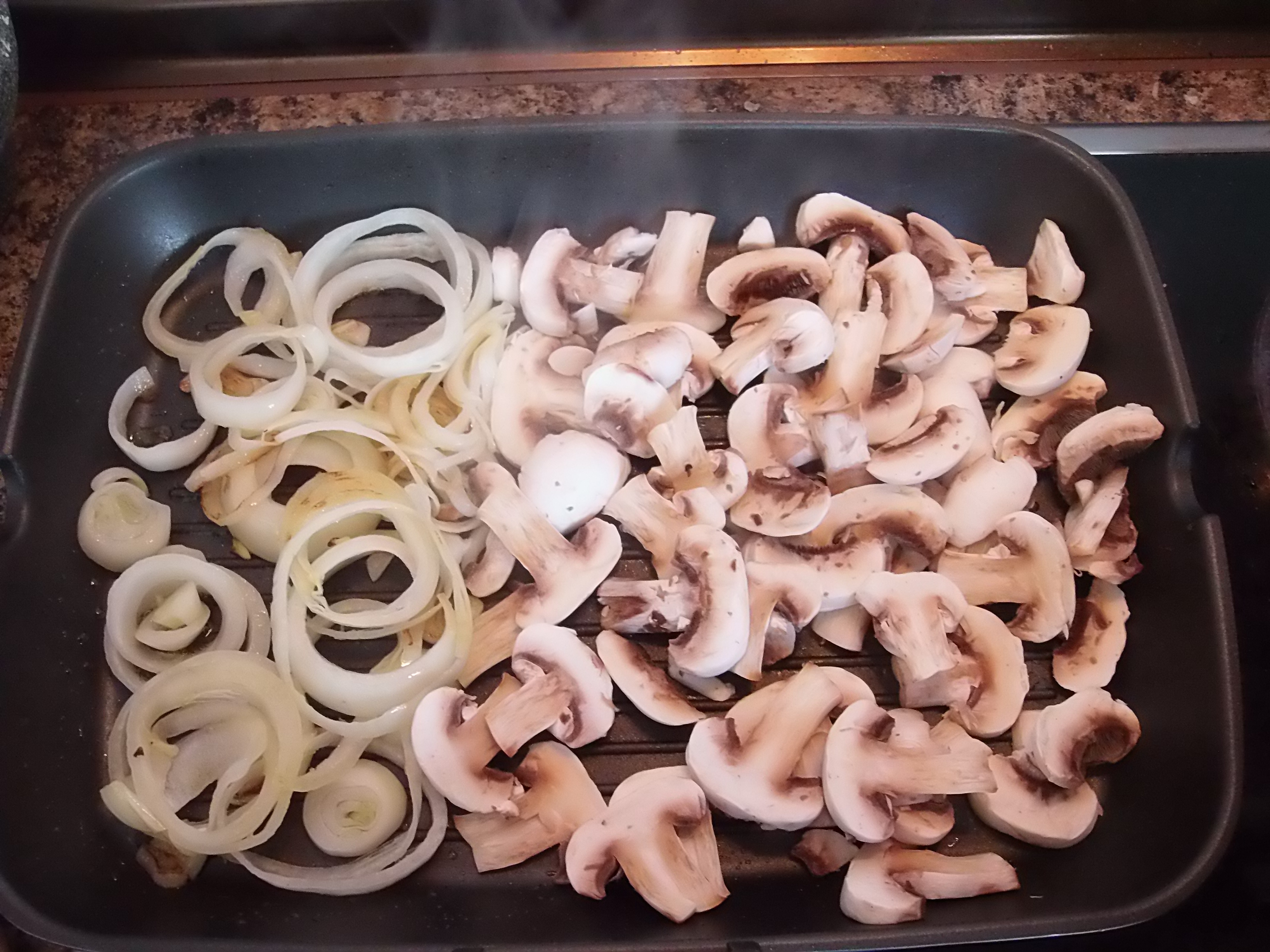 - Once your grill pan is hot (high flame) add onion and mushroom. For the time being use separate parts of the pan for the onion and the mushrooms. Boil water with eggs and prepare your hard boiled eggs.