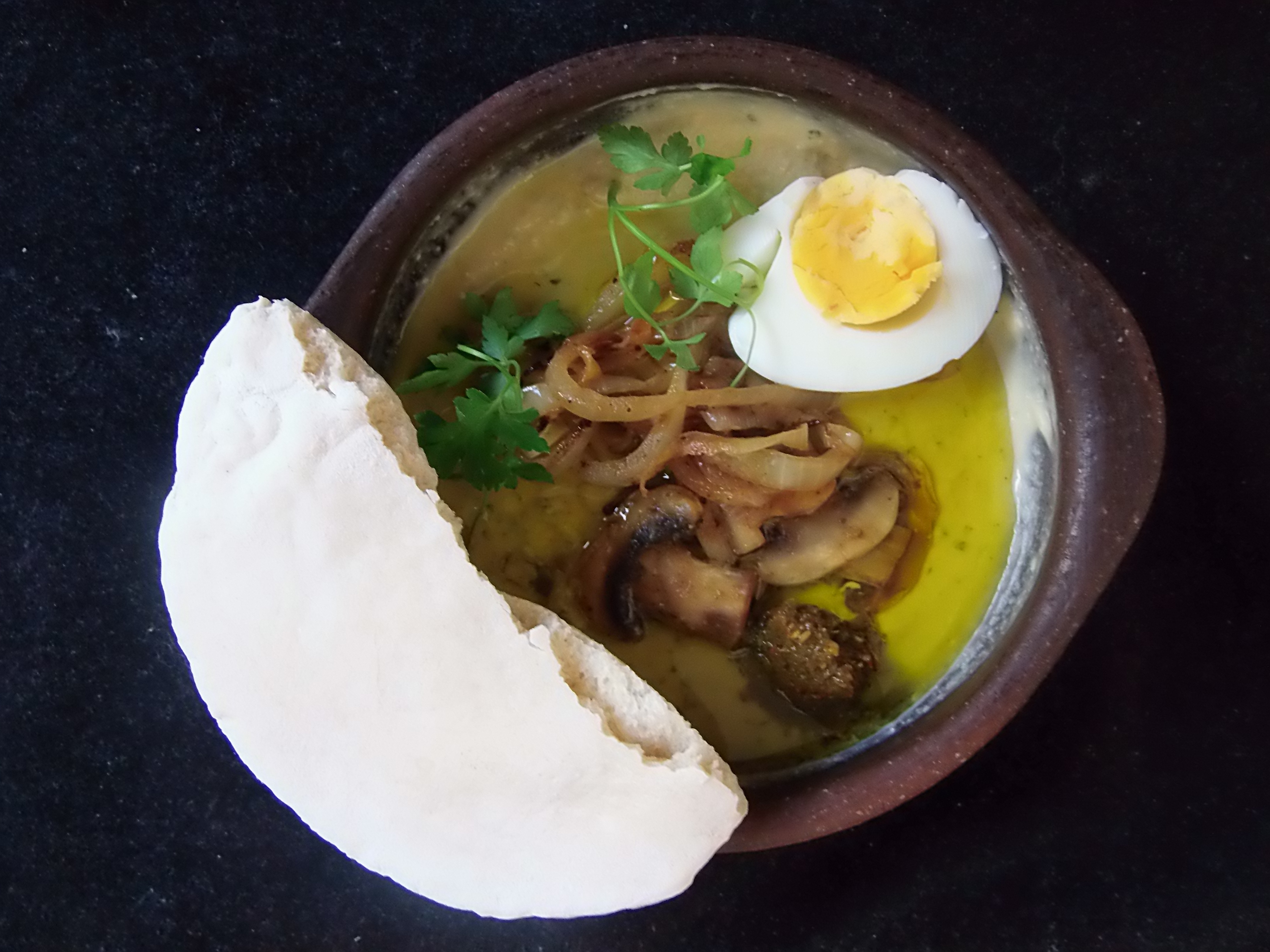 - Peel your egg and serve hummus: Put a nice portion of hummus in a bowl, add one spoon of the seasoned chickpeas, some grilled onion and mushrooms, hard-boiled egg (sliced on half), parsley, lemon juice and generous amount of olive oil. Sprinkle paprika on top. Serve with fresh pita and skhoug.