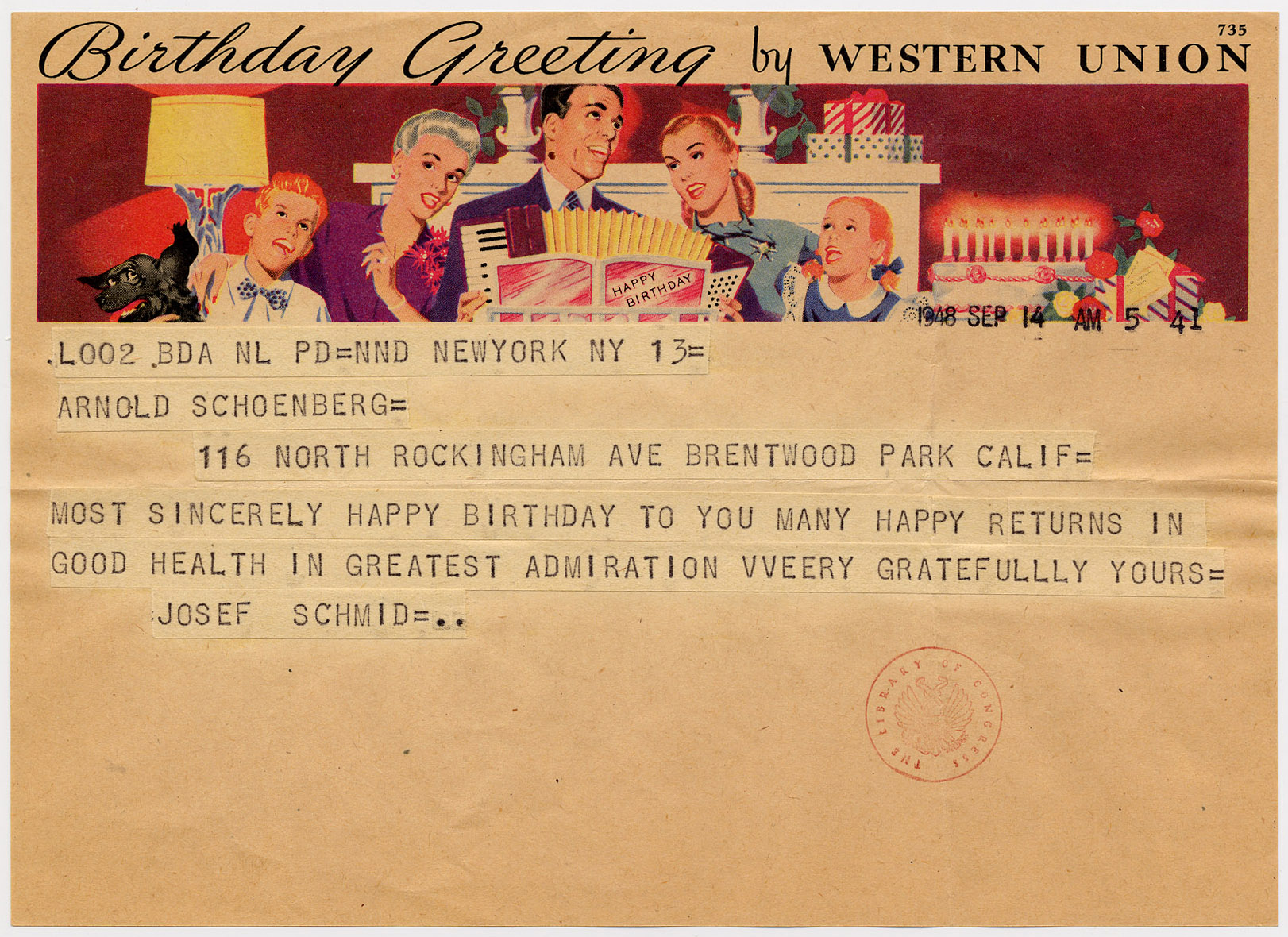 The Archive of the Arnold Schönberg Center in Vienna contains copies of a number of short letters and telegrams from Schmid to Schoenberg, such as this one from 1948 wishing happy birthday.