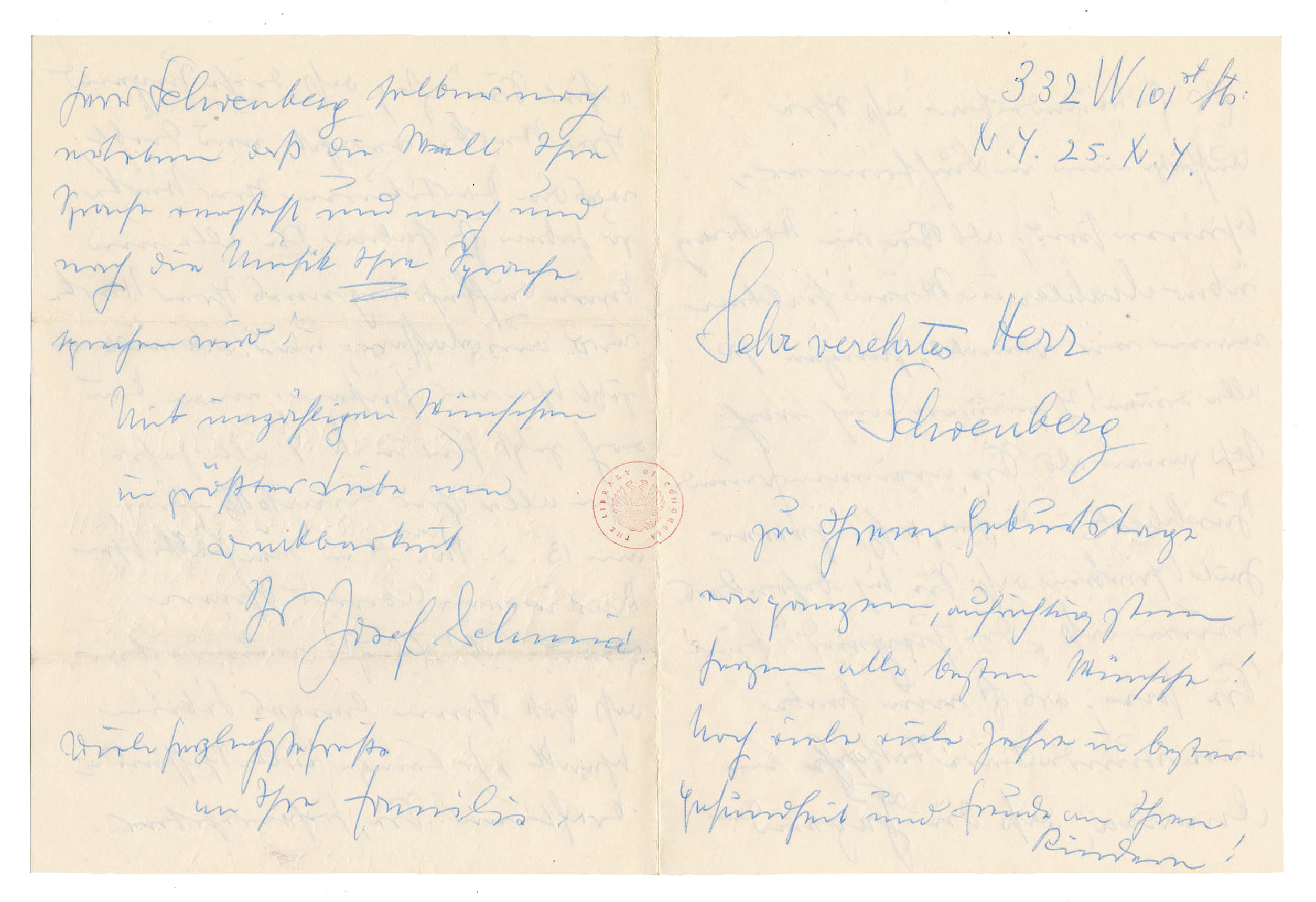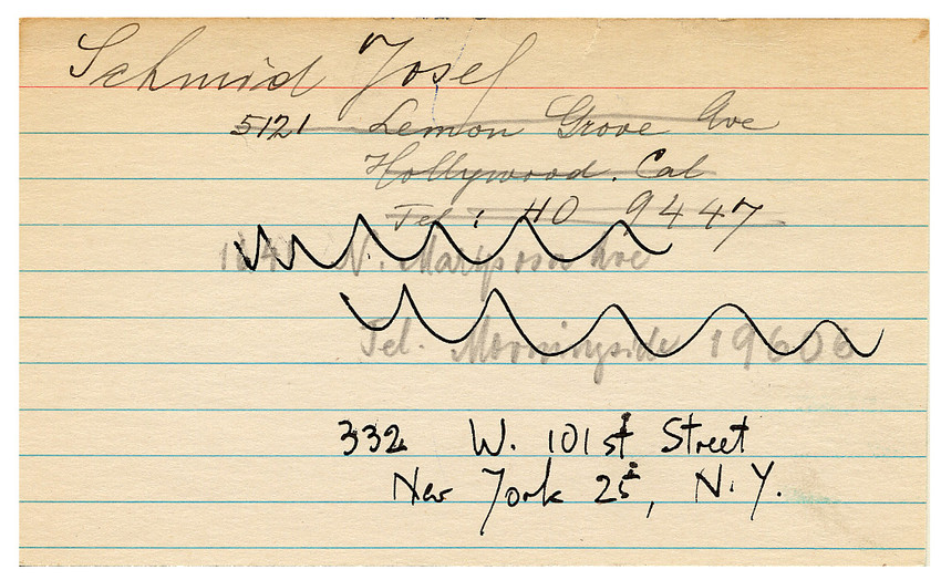 The Schönberg Center has an address card for Josef Schmid, with the notes: “Josef Schmid (born Germany, 1890 – died New York City, 1969) was a conductor, composer, and composition teacher. He was one of the first students of Alban Berg, with whom he studied before World War I.