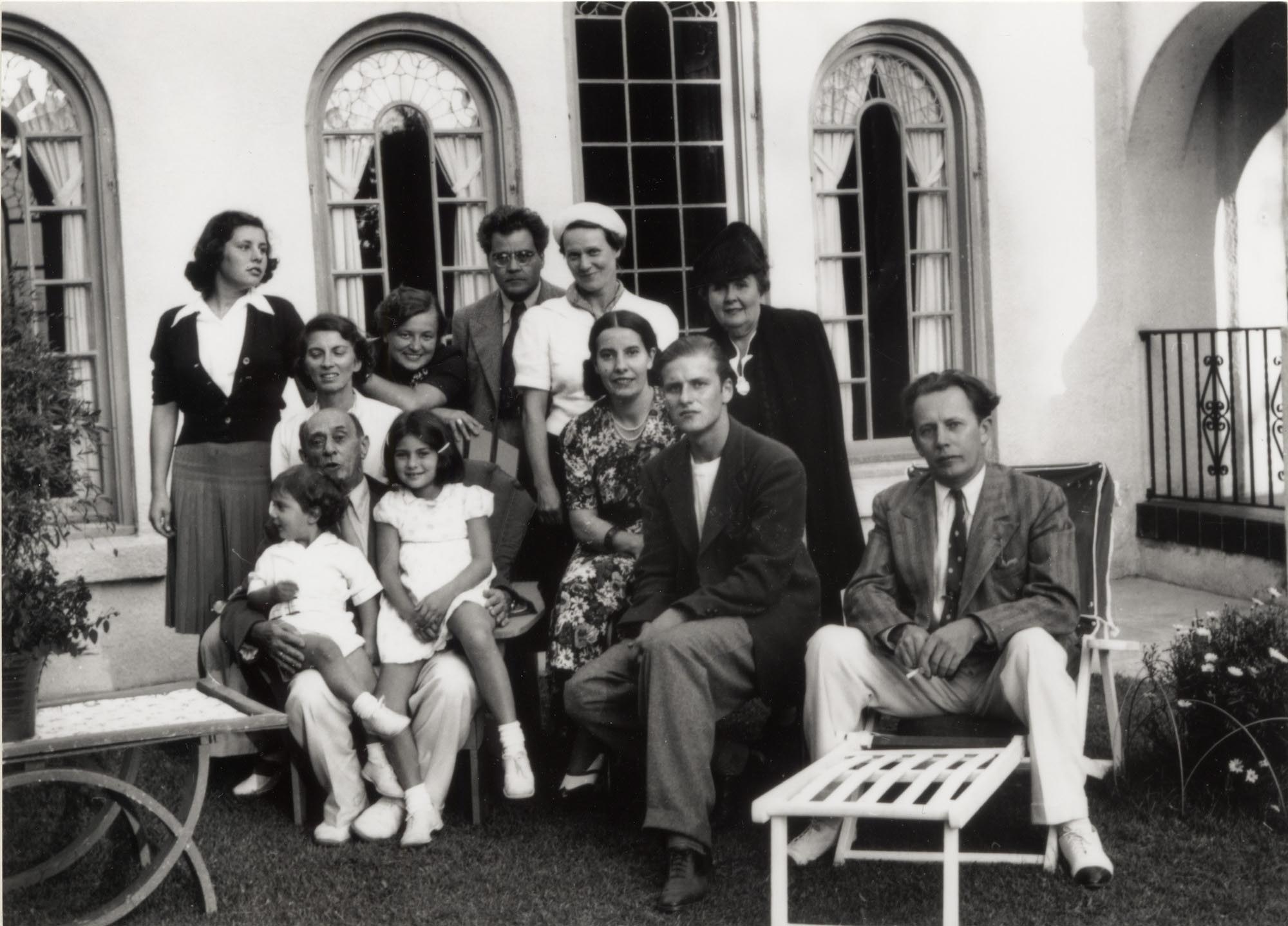 (First row left to right: Arnold, Ronald and Nuria Schoenberg, Mitzi Weiss, Werner Klemperer, Adolph Weiss. Second row: Unidentified woman, Gertrud Schoenberg, unidentified woman, Mr. & Mrs. Joseph Schmid, Mrs. Joseph Achron. Taken in front of the Brentwood home)
