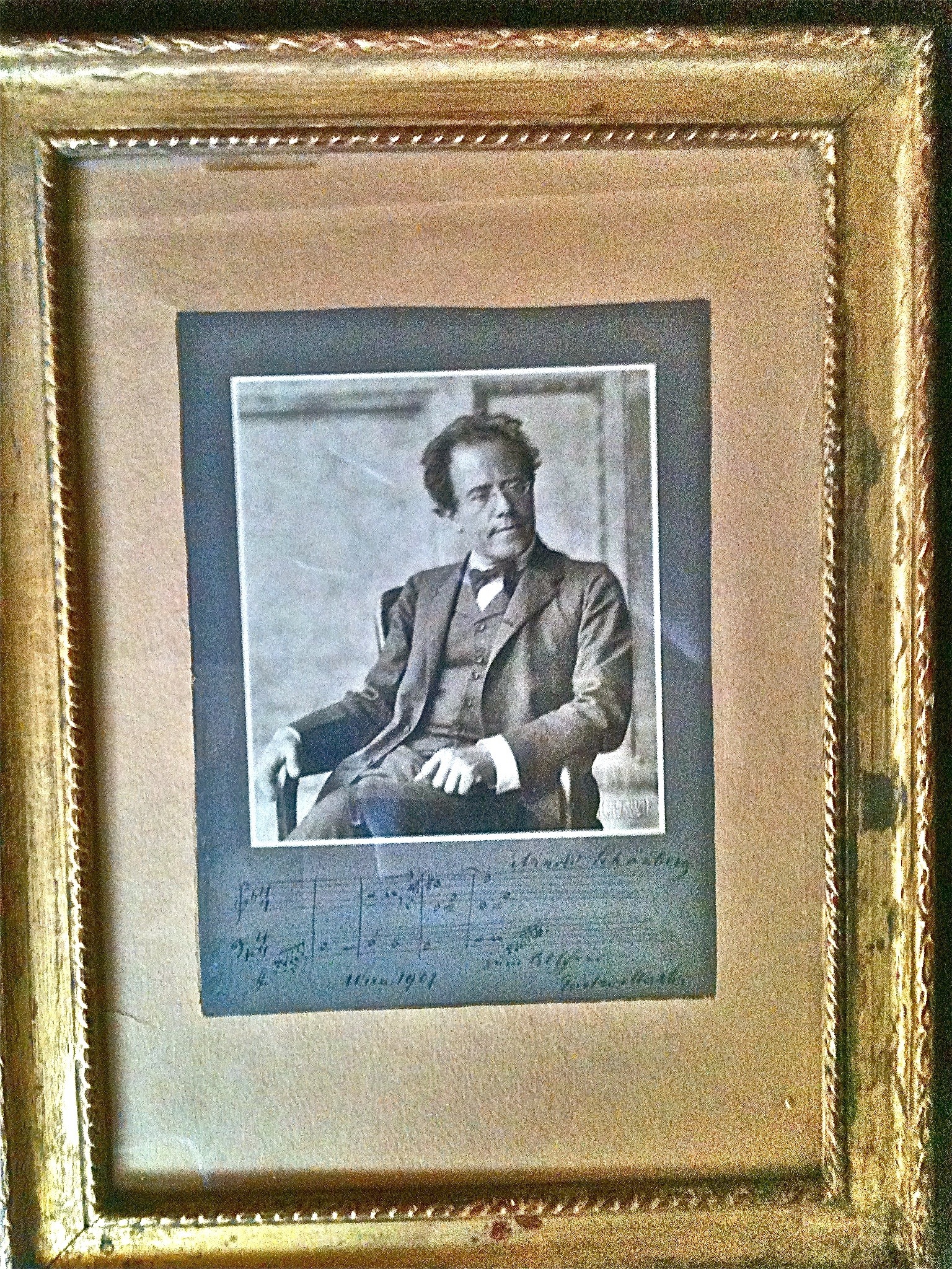 A missing photograph of Gustav Mahler with a dedication to Arnold Schoenberg has recently been found in the San Fernando Valley. The photo was given to Schoenberg probably before Mahler’s departure to New York in 1907. You can see it hanging on the wall above Schoenberg’s desk (to the left, below Schoenberg’s portrait of Mahler in this photo from around 1912.