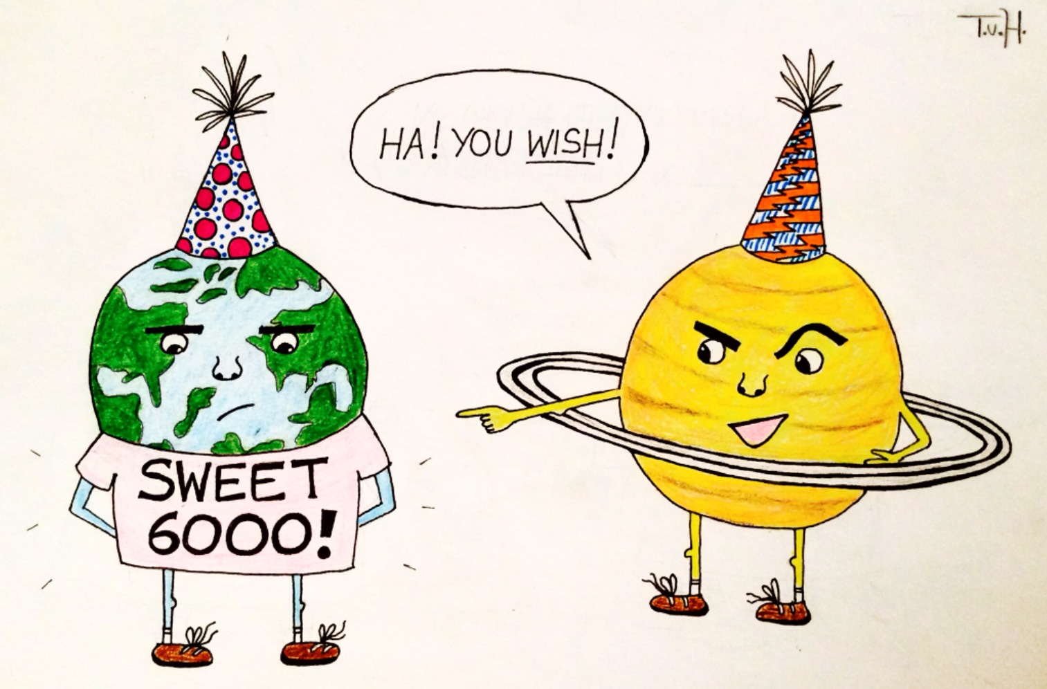I decided to take a short break from practicing for my recital next week and draw a lighthearted depiction of our poor planet’s resentment towards growing older. Given the worldwide human hatred of aging, why would the very planet we live on feel any different about it?